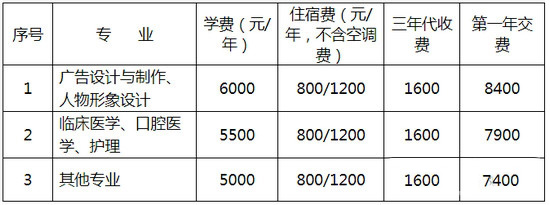 代收费:包含:体检费44元、教材费1200元、军训服100元、城镇医疗保险每年220元。