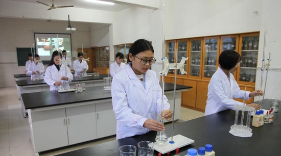 湘潭医卫职业技术学院的药学实训中心面积约1200m2,固定资产总值达320多万元,包括药用基础化学实训室、药物化学实训室、药物分析和检测技术实训室(2间)、药物制剂技术实训室、生物化学实训室、精密仪器室(2间)、实训预备室,中药陈列标本室等。拥有高效液相色谱仪、气相色谱仪、双光束紫外分光光度仪、紫外-可见分光光度计、自动旋光仪、智能崩解仪等高新仪器设备,确保校内实验实训开出率达到100%。
